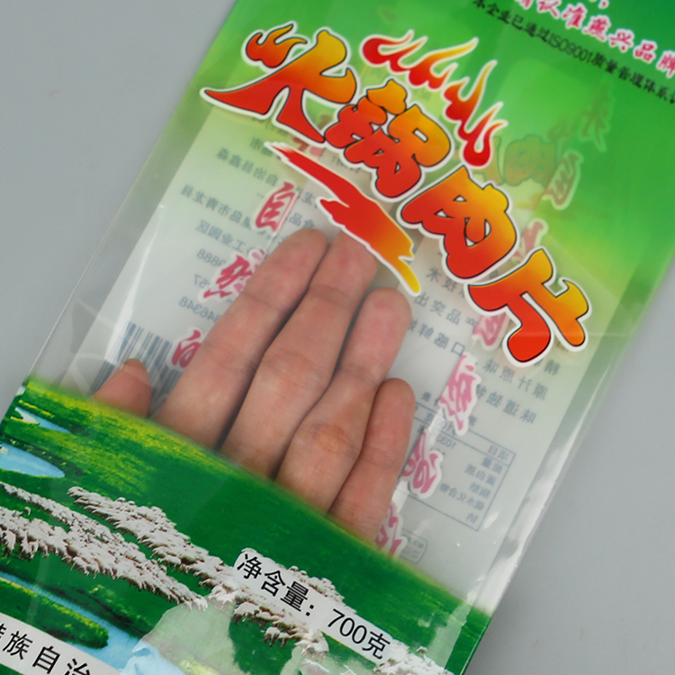 產(chǎn)品名稱(chēng):700g火鍋肉片+亮面塑料復合+背封帶折邊