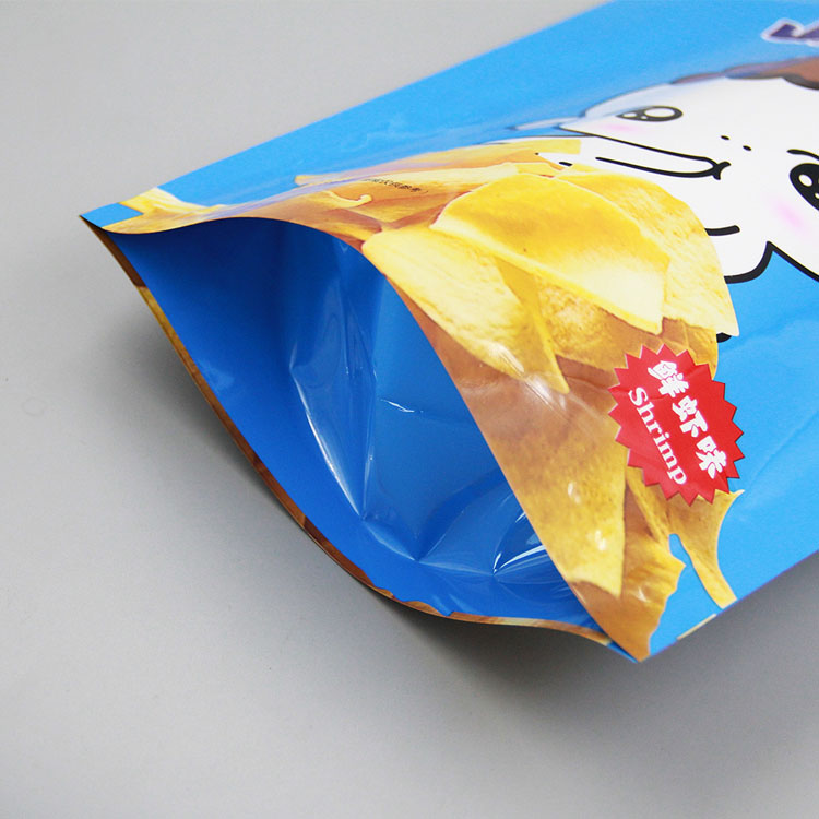 本產(chǎn)品為亮面鍍鋁 自立袋 ,包裝增加鍍鋁層,能很好的起到防水防潮的效果,為薄片類(lèi)食品提供一個(gè)干燥空間,保證食品到消費者口中依然酥脆。亮面包裝印刷銀色更鮮艷,更具光澤